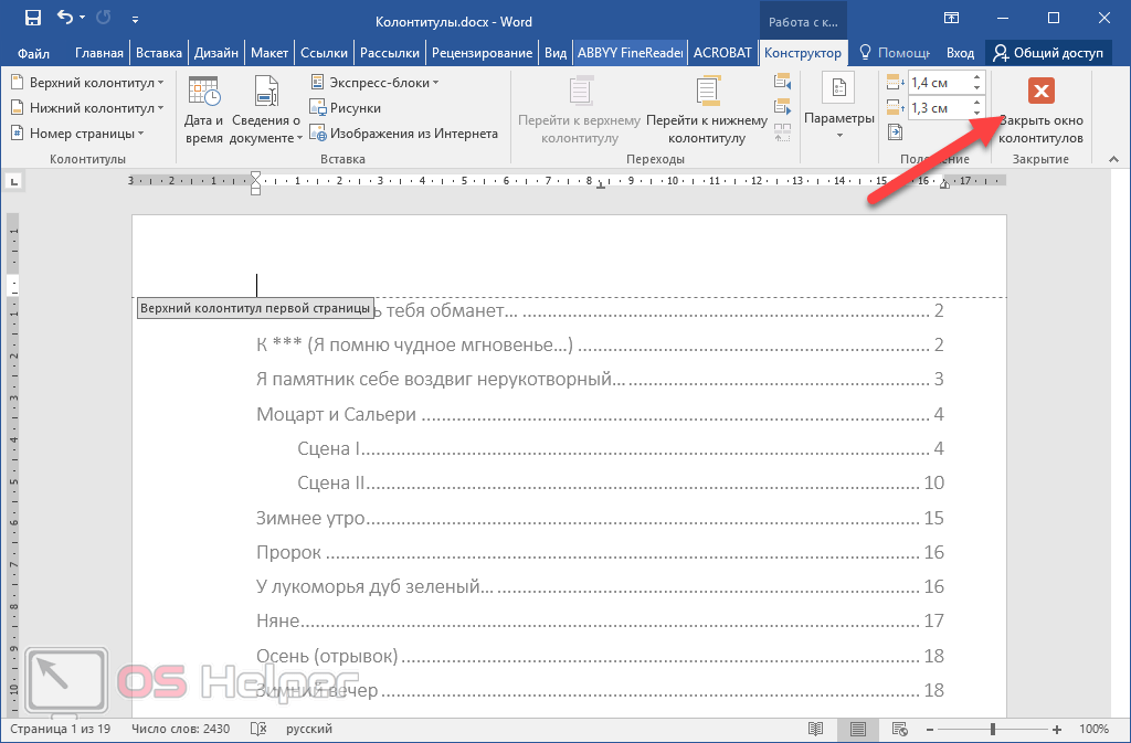 После того как колонтитул удален, нажмите на кнопку «Закрыть».
