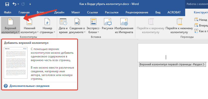 , расположенной в главной вкладке «Работа с колонтитулами»