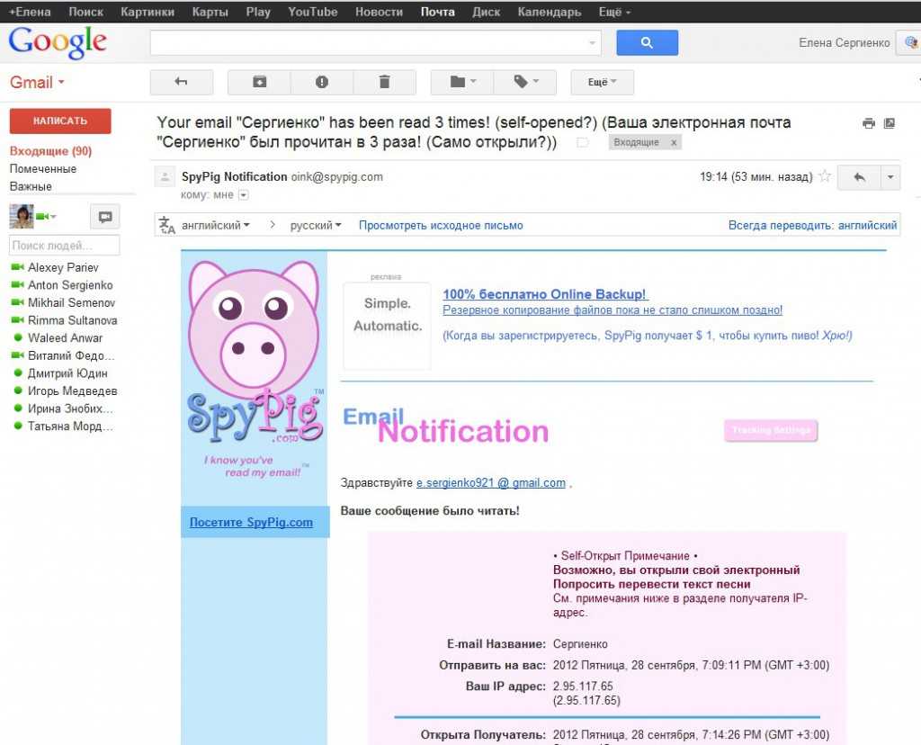 Я очень довольна – теперь я буду использовать эту фишку в своей работе, да и менеджеров своих научу. В уведомлении, кстати, вы сможете увидеть время прочтения, примерный адрес местонахождения получателя и его ip-адрес. Следующий свой телефонный звонок клиенту вы можете теперь начать с фразы: “Я знаю, вы читали мою электронную почту!”