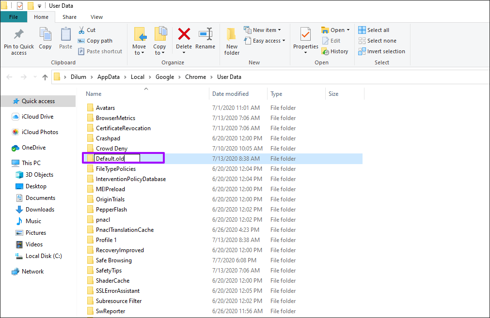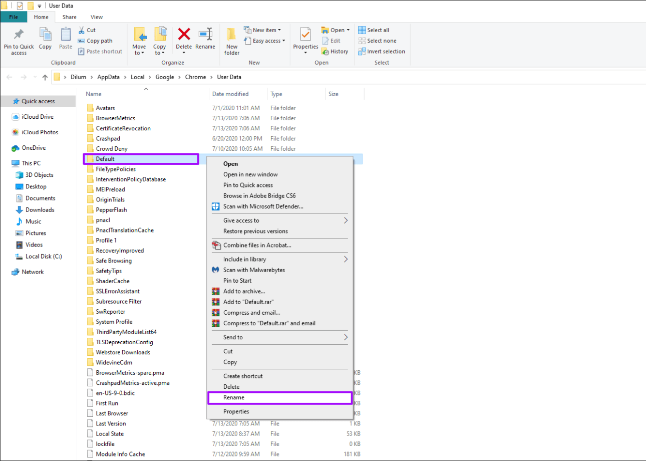 Шаг 3: Щелкните правой кнопкой мыши папку с надписью «По умолчанию» (которая содержит данные вашего профиля пользователя) и выберите «Переименовать».