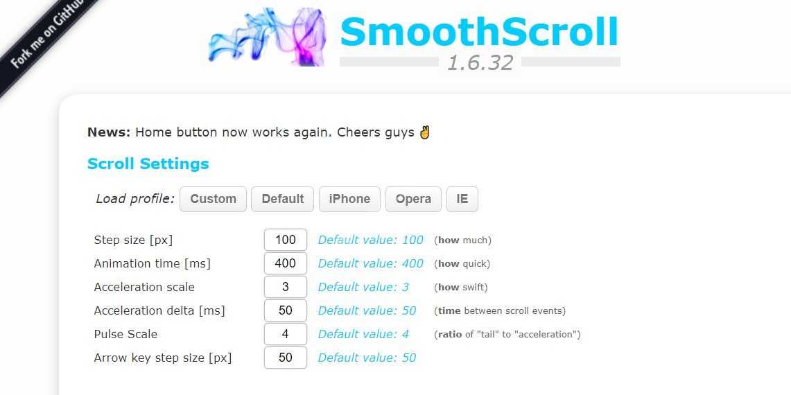 Если рассмотренный способ не дал результата, или вас не устраивает полученный эффект, можно пойти другим путем и установить дополнительное расширение. Один из вариантов — применение SmoothScroll. Это одно из лучших дополнений, позволяющее настроить уровень и скорость плавности, силы вылета за границы дисплея и другие нюансы. При этом настройка плавной прокрутки в Google Chrome проходит в режиме онлайн, что позволяет сразу увидеть изменения.