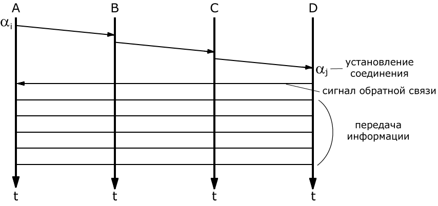 Абонент ai{\displaystyle ~a_{i}} инициирует установление связи с абонентом aj{\displaystyle ~a_{j}}. Узел (коммутатор) связи А, используя адрес абонента aj{\displaystyle ~a_{j}}, выбирает физический канал с промежуточным узлом коммутации узлом B. Процедура повторяется с промежуточным узлом коммутации C и оконечным узлом коммутации D. После получения ответа с узла D устанавливается физическое соединение между узлами ai{\displaystyle ~a_{i}} и aj{\displaystyle ~a_{j}}, а затем начинается передача данных.