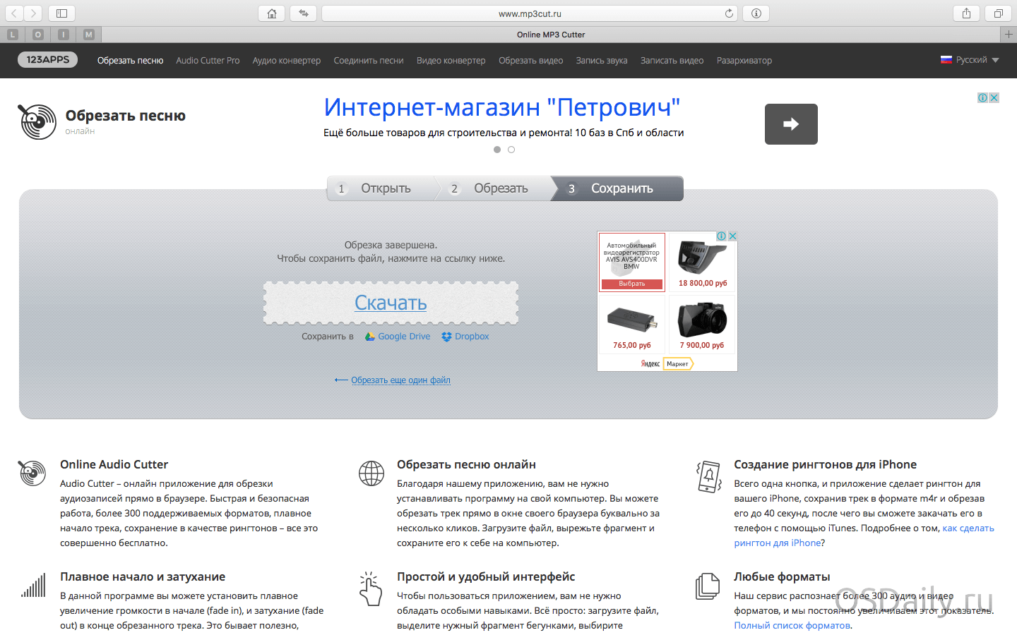 Аналогичный сервис, работающий по такой же схеме. Единственное отличие – более понятный и гибкий интерфейс. Подходит и для продукции Apple. Нам опять требуется выбрать музыку, загрузить ее на сервис, оформить отрезок и скачать.