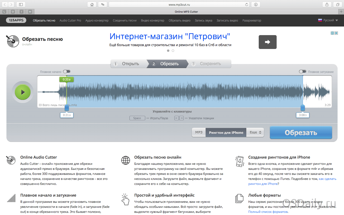 Ещё один онлайн-сервис, позволяющий обрезать аудиофайл для создания рингтона. В отличие от предыдущего сайта, имеет более минималистичный интерфейс, намного меньше функций, но позволяет с точностью до секунды вводить нужное место в песне мануально, то есть, самому вписать начало и конец отрывка.