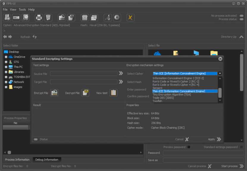 Приложение включает следующее стандартное шифрованиеалгоритмы: Advanced Encryption Standard (размер блока 128 бит, длина ключа: 128, 192 и 256 бит) Blowfish Haval (256 бит, 5 проходов) CAST-128 (CAST-5) CAST-256 (CAST-6) Механизм сокрытия информации (ICE) Механизм сокрытия информации 2 (ICE-2) ICE Encrypt MISTY-1 (Улучшенная технология безопасности Mitsubishi) Код Рона 2 или Шифр 2 Ривеста (RC-2) Код Рона 4 или Шифр 4 Ривеста (RC-4) Код Рона 5 или Rivest’s Cipher 5 (RC-5) Ron’s Code 6 или Rivest’s Cipher 6 (RC-6) Serpent Tiny Encryption Algorithm (TEA) Twofish Доступные хеш-функции: Secure Hash Algorithm 1 RIPEMD-160 Haval Дайджест сообщения 5 Дайджест сообщения 4 Tiger RIPEMD-128 SHA-256 (семейство SHA-2) SHA-384 (семейство SHA-2) SHA-512 (семейство SHA-2)