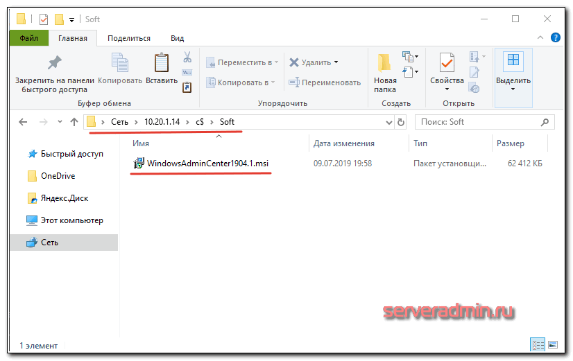 Заходим на любой диск гипервизора через обычный проводник windows и передаем туда скачанный инсталлятор WindowsAdminCenter1904.1.msi. В качестве авторизации используем учетную запись администратора.