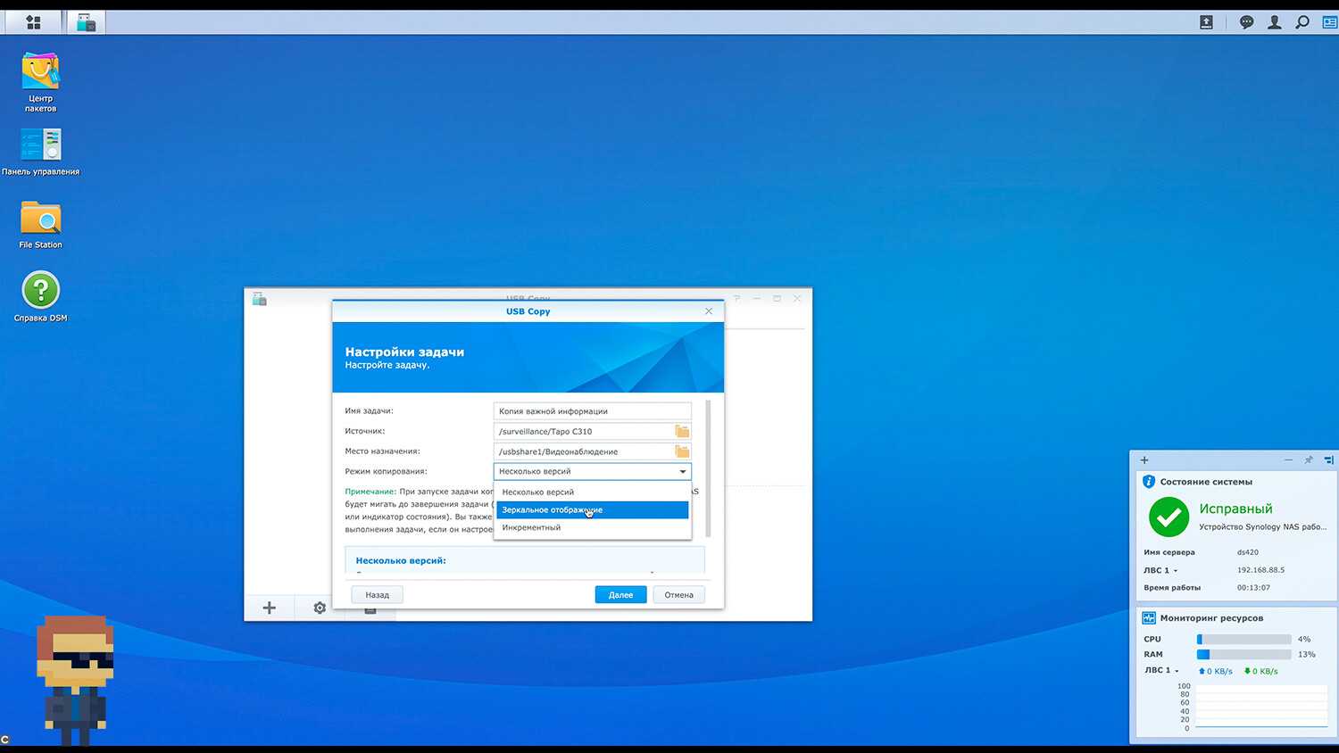 Задаем имя задачи, в качестве источника для экспорта выбираем папку, я выберу папку с файлами видеонаблюдения. А место назначения – это внешний диск. На котором создаю новую папку. Режимов копирования три: несколько версий, зеркальное отображение и инкрементный. Выбирайте подходящий именно вам, так как способ копирования у них сильно отличается.