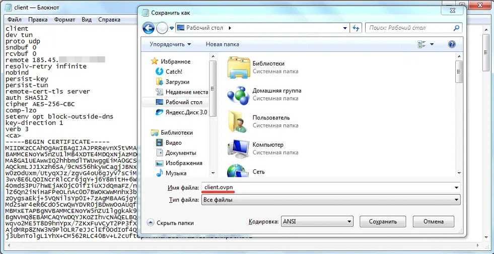 - Перенести файл блокнота на рабочий стол и назвать его client.ovpn.