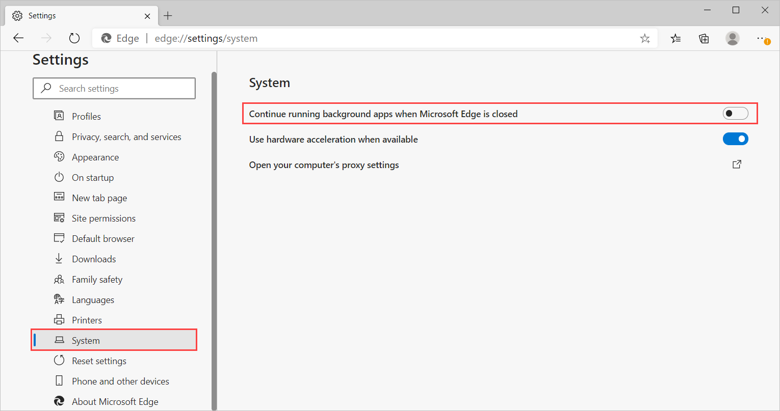 Чтобы отключить этот параметр, перейдите в раздел Параметры -> Система и выберите ползунок рядом с пунктом Продолжать выполнение фоновых приложений после закрытия Microsoft Edge.