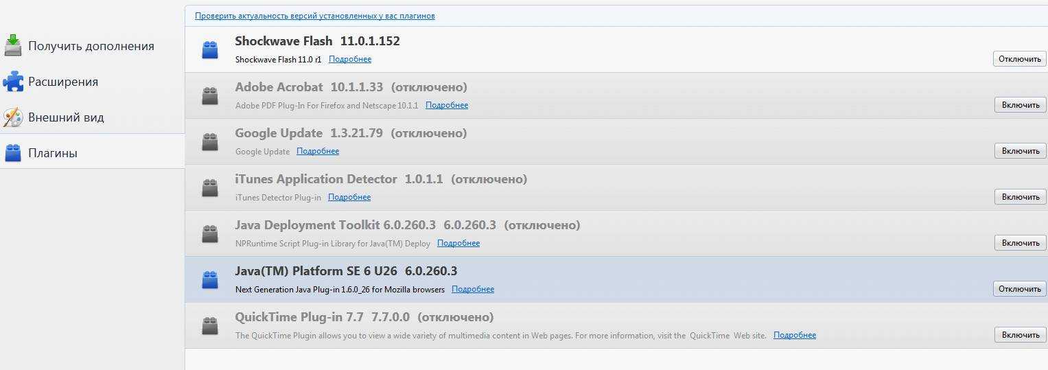 Здесь, пожалуй, стоит отключить всё кроме Shockwave Flash и Java TM Platform (хотя оный плагин бывает нужен далеко не всегда и не всем). Остальное, как правило, понакрученые разными приложениями надстройки, смысла в которых решительно никакого нет. Как вариант еще можно оставить Adobe Acrobat (отвечает за открытие PDF-файлов напрямую в Firefox), но лично я предпочитаю пользоваться одноименным приложением, а не плагином.