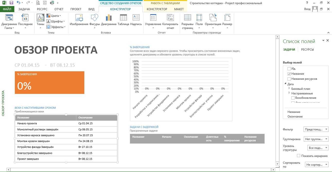 - Панель мониторинга. Отчеты группы: «Выборка», «Обзор затрат», «Обзор проекта», «Обзор трудозатрат», «Предстоящие задачи»