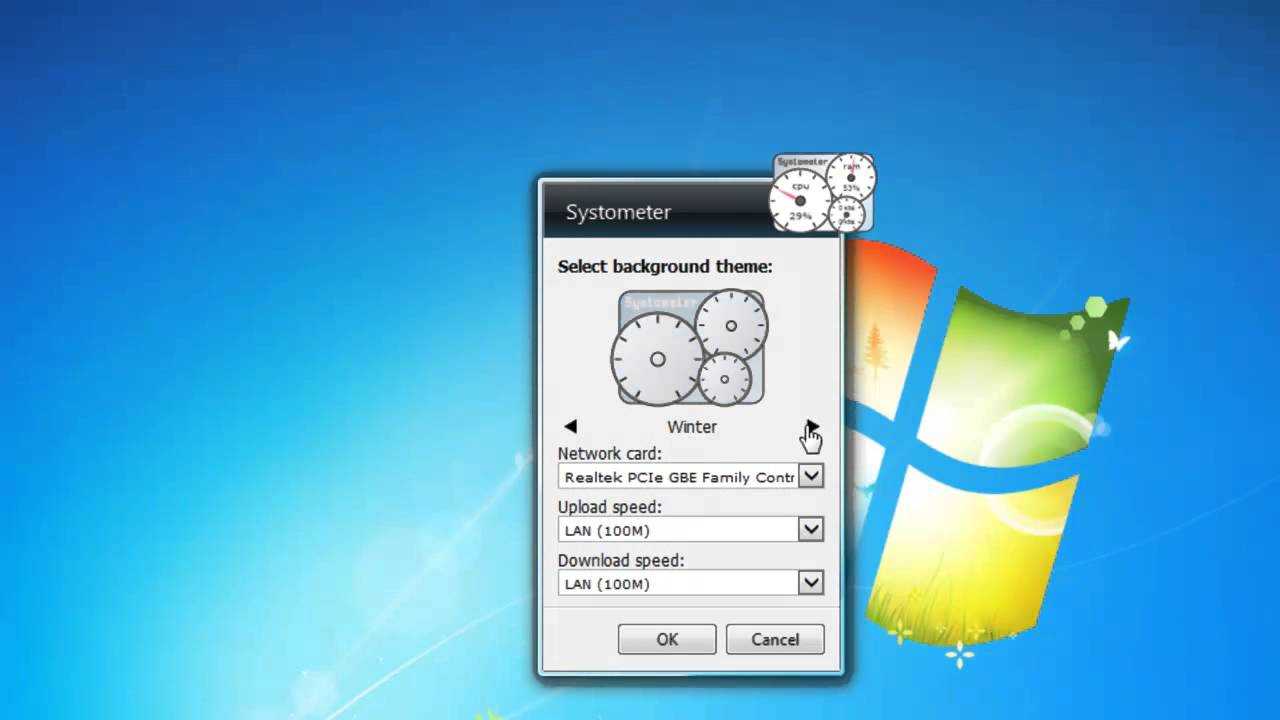 Измеритель, показывающий степень загрузки оперативной памяти и скорость интернет соединения. Также виджет измеряет нагрузку на процессор компьютера. Имеется несколько тем оформления для выбора. На главном окне расположено три датчика, показывающие основные параметры.