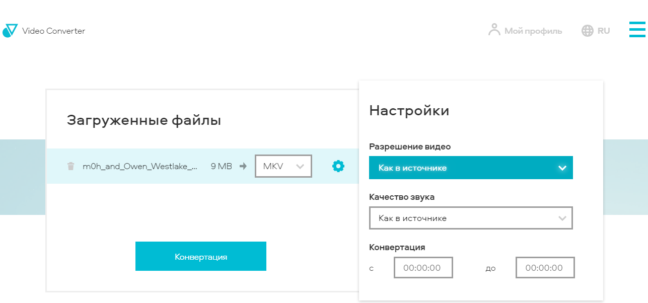 Сервис Online Video Converter позволяет конвертировать файлы более чем в 40 форматов, среди которых: MKV, AVI, FLV. Конвертировать можно как видеофайлы, так и аудиофайлы. Файлы до 15Гб, конвертируются в течение 5 минут. Видео по 20Гб и больше, конвертируется от 20 минут, могут быть ошибки и сбои конвертации. Видео можно сохранять в высоком качестве Full и Ultra HD.