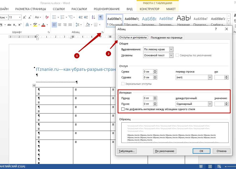 В открывшемся окне необходим подраздел – «Отступы и интервалы». Нужно рассмотреть числовые величины интервалов перед и после выделенного абзаца. Если показатель слишком большой, то именно из-за него произошел разрыв страницы и его в Ворде нужно убрать.