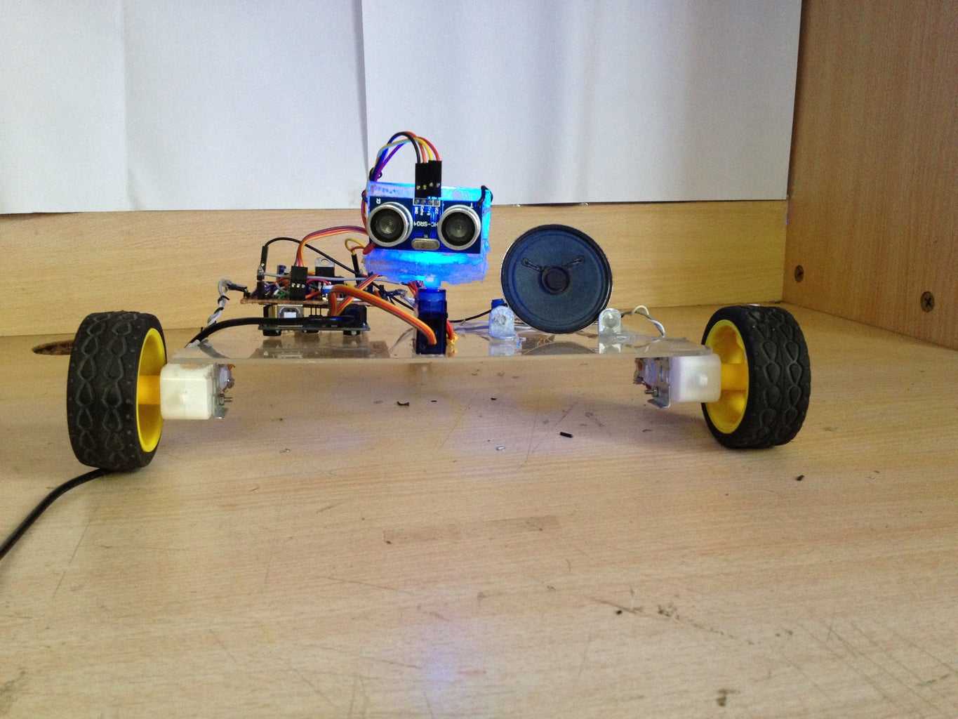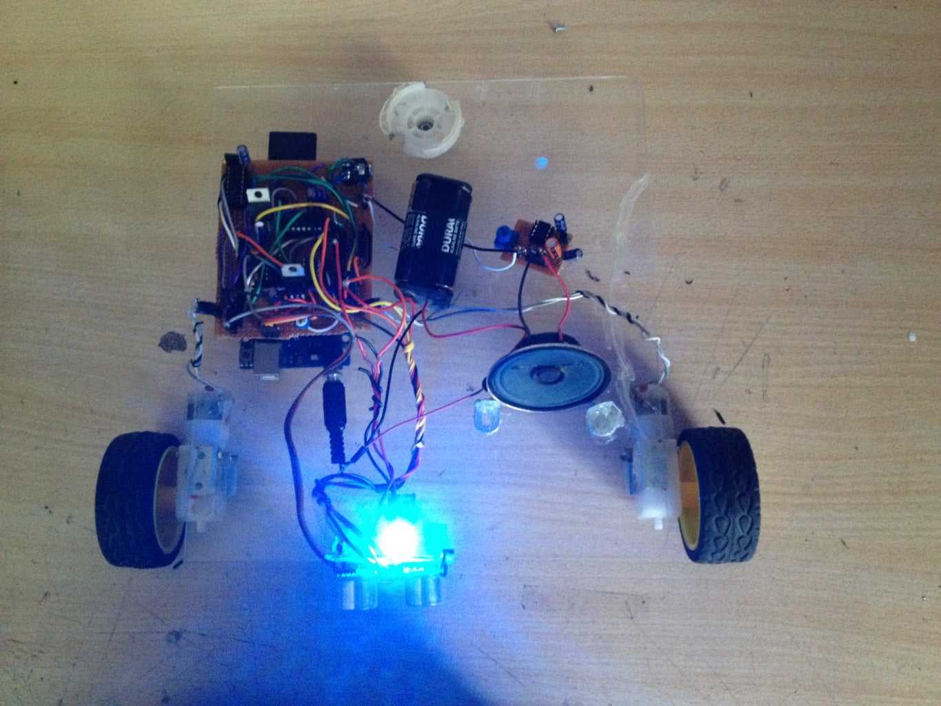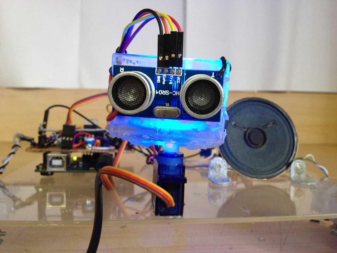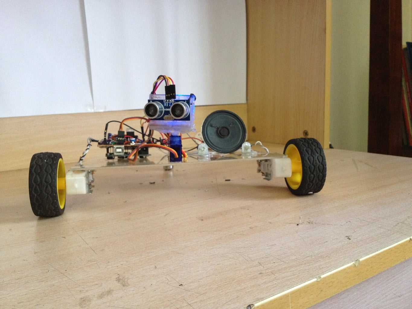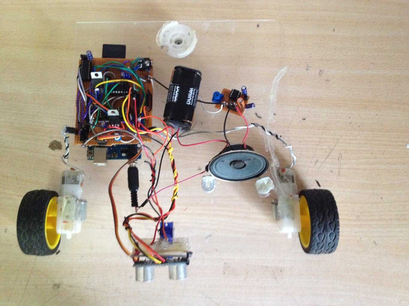 He can talk using a wave shield.The speaker used is rated 1/2W and 8 ohms.For the chassis I used a 4mm thick acrylic sheet (about 22cm X 20cm)…right now the chassis is only temporary as I plan to make a more robust one.