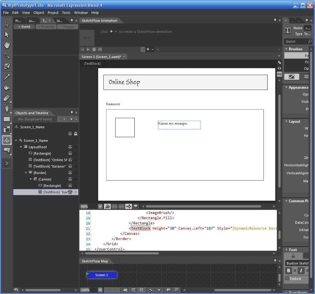 Помимо инструментальных средств, предоставляемых для построения изящно оформленных пользовательских интерфейсов, в состав Expression Blend входит набор инструментов, позволяющих оперативно создавать прототипы приложений средствами SketchFlow. Этот компонент Expression Blend дает возможность быстро и эффективно имитировать и определять последовательность операций в пользовательском интерфейсе приложения, компоновку экранов и переход из одного состояния приложения в другое.