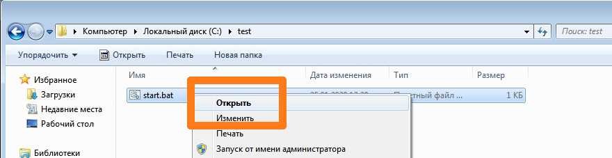 В нашем примере, мы переходим в папку test на диске C:\ и запускаем файл start.bat, который мы ранее написали.