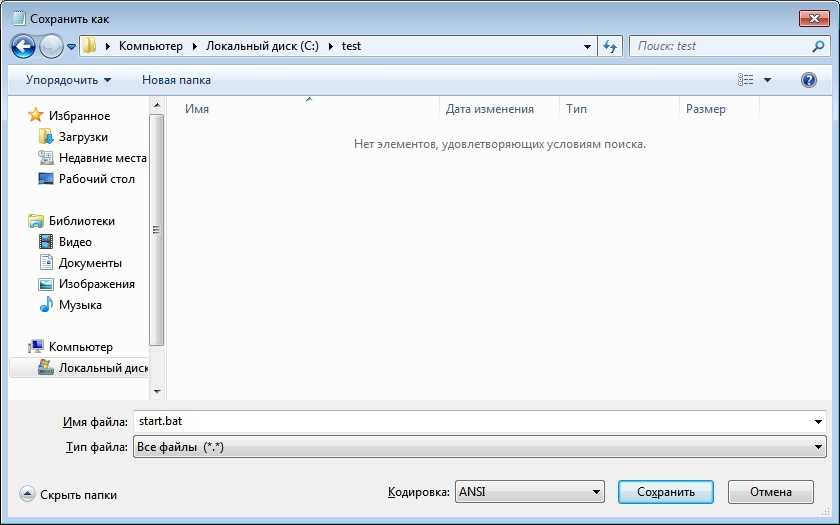 Выберите Тип файла — Все файлы, в поле Имя файла введите start.bat и сохраните его в папке test на диске С.