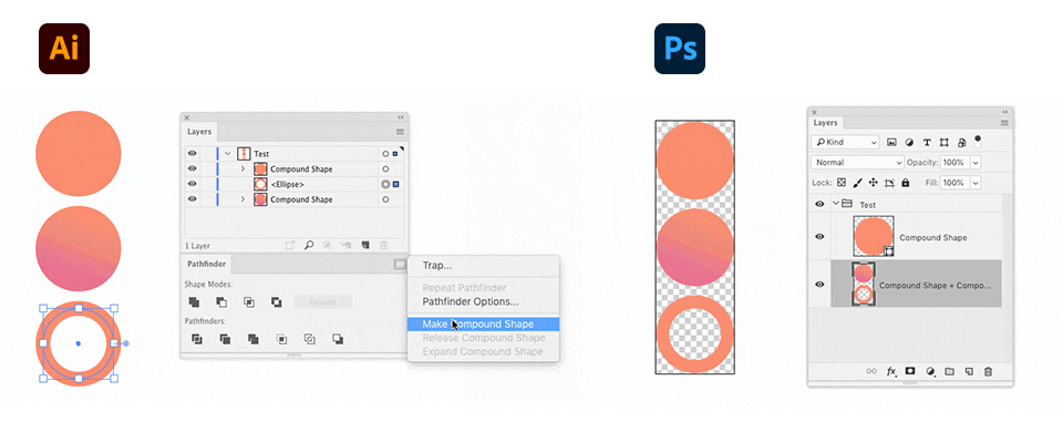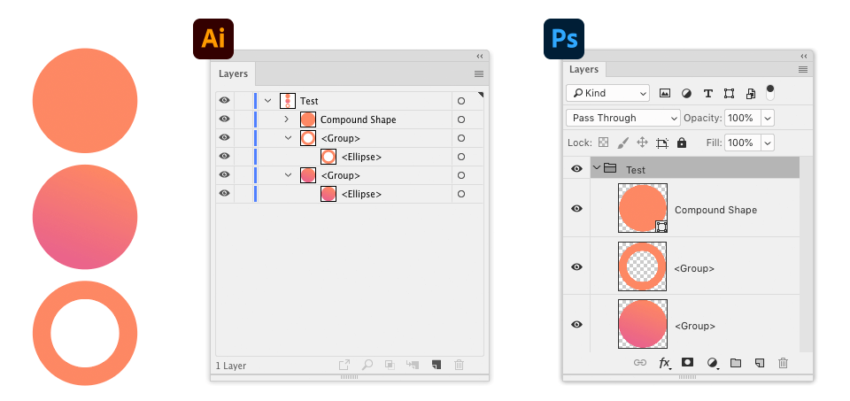 Верхний круг при открытии в Фотошопе сохранил цвет и остался векторным шейпом. Соседние объекты растрировались, значит этот способ не поможет перенести редактируемые градиенты и обводки в PSD.