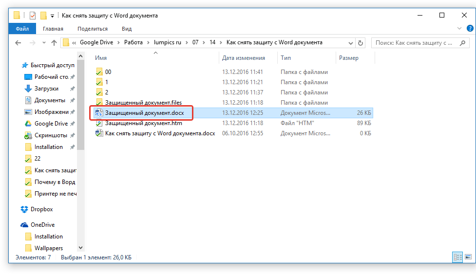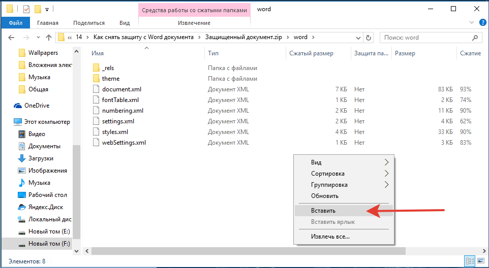 Откройте папку, в которой содержится защищенный файл, и измените его расширение с DOCX на ZIP. Для этого выполните следующее: