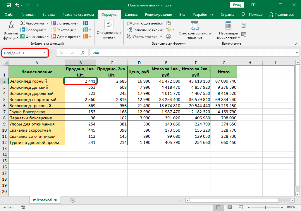 Допустим, ячейке B2 присвоено имя “Продажа_1”.