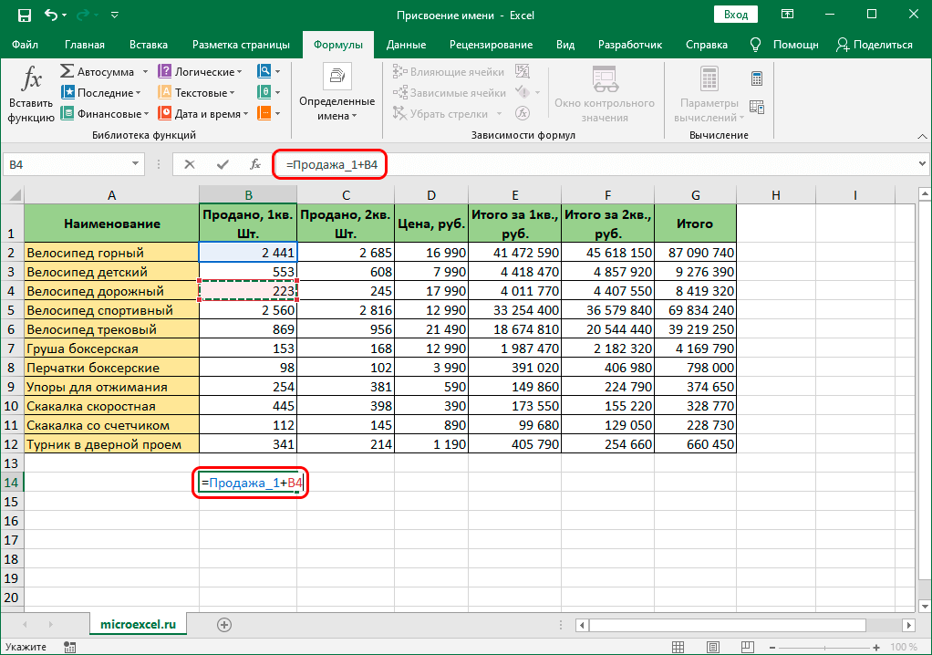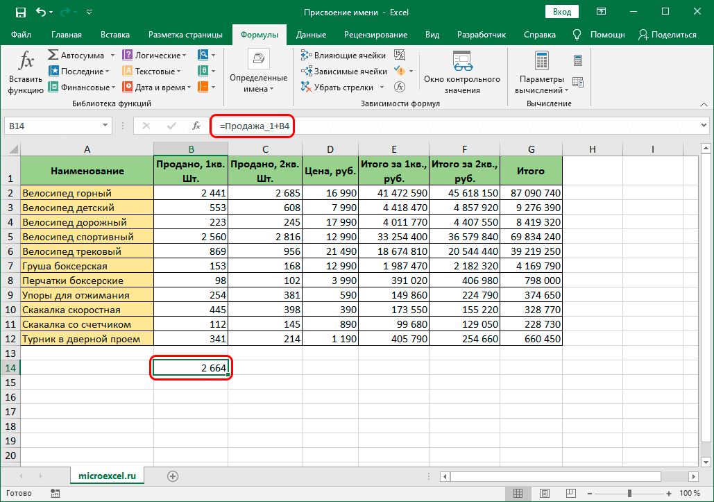 Если она будет участвовать в формуле, то вместо B2 мы пишем “Продажа_1”.