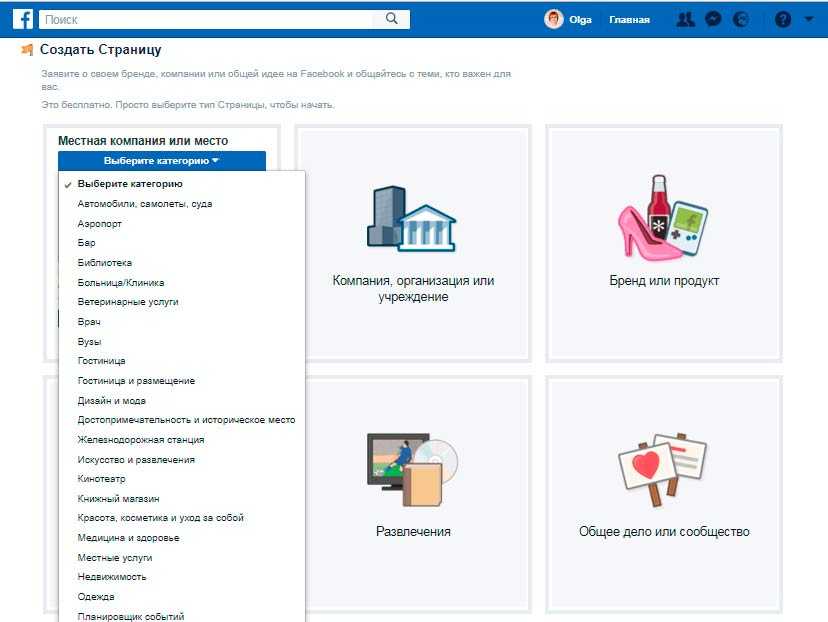 У всех типов страниц за исключением «Общего дела или сообщества» есть категории. Категория конкретизирует, чему посвящена страница. Например, для местных компаний доступны категории: ресторан, продуктовый магазин, туристическое агентство, семейный врач. Для брендов и продуктов: мебель, бытовая техника, ювелирные изделия, видеоигра и другие.