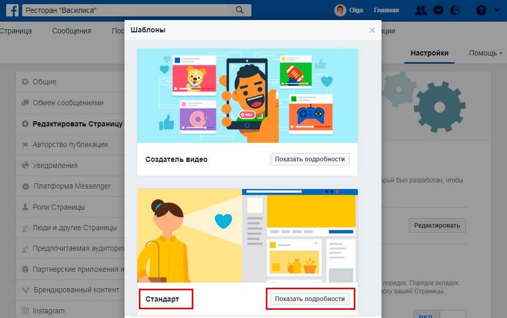 Фейсбук предлагает девять шаблонов: «Рестораны и кафе», «Компания», «Площадки», «Покупки», «Некоммерческая организация», «Политики», «Услуги», «Создатель видео» и «Стандарт». Чтобы посмотреть, какие кнопки и вкладки входят в шаблон, нажмите «Показать подробности». Если затрудняетесь с выбором шаблона, ставьте «Стандарт».