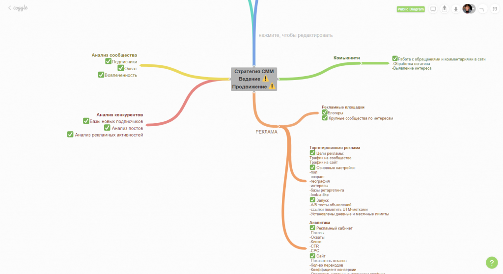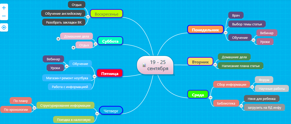 Итак, получилось, что-то напоминающее пошаговый план. Из данной интеллект карты можно увидеть, что некоторые разделы можно более детально раскрыть, то есть разделить на подразделы.