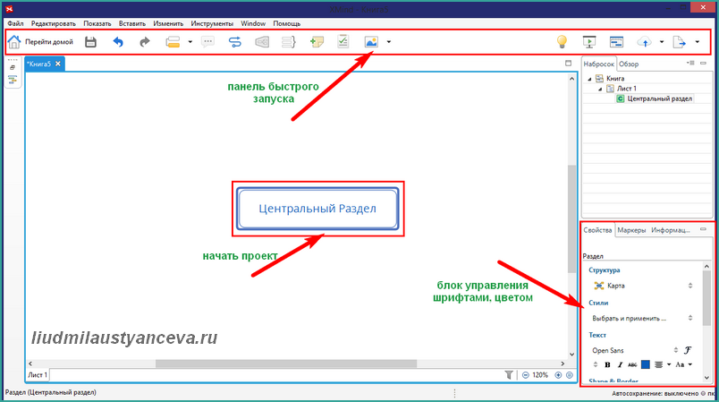 Выбирая «пустой» переходите в «Центральный раздел» и приступаете к созданию интеллект карты в XMind.