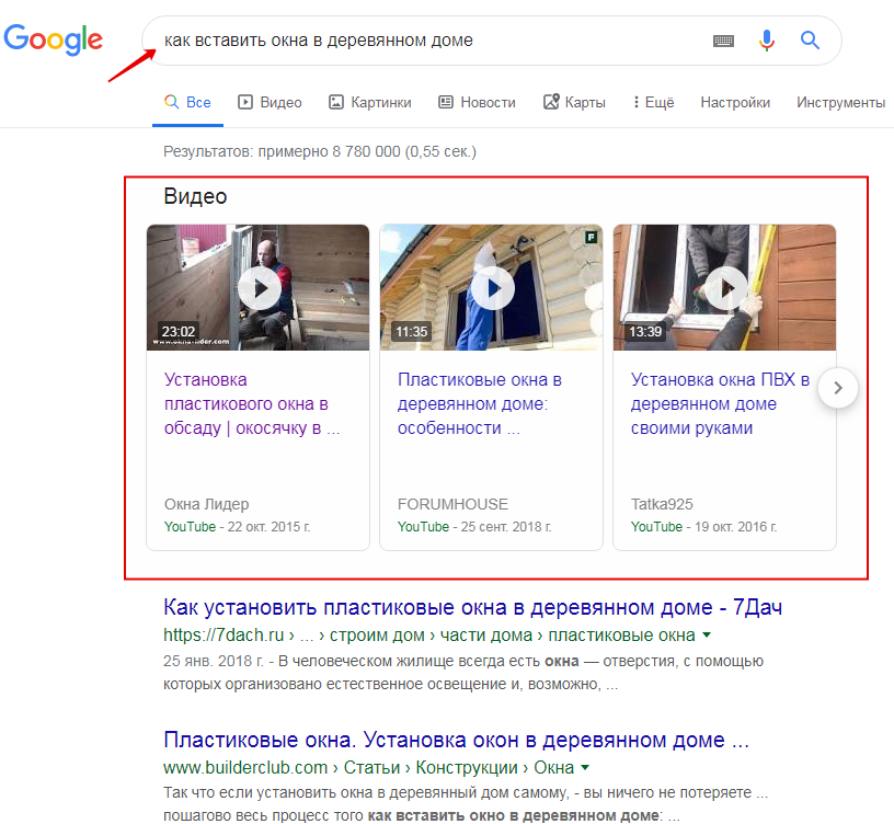 По некоторым запросам Google добавляет в результаты видео. Ключевые слова с видео в результатах обычно касаются тем спорта, обучения, запросов с конструкцией «как сделать что-то».