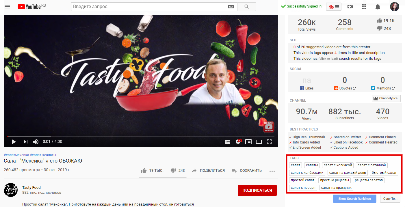 Это — бесплатное расширение для браузера Google Chrome. Установите его в браузер, и сможете просматривать теги под любым видео. Расширение покажет не только теги, но и позицию конкретного видео по ним. Это можно использовать для подбора своих тегов и анализа конкурентности по ним.
