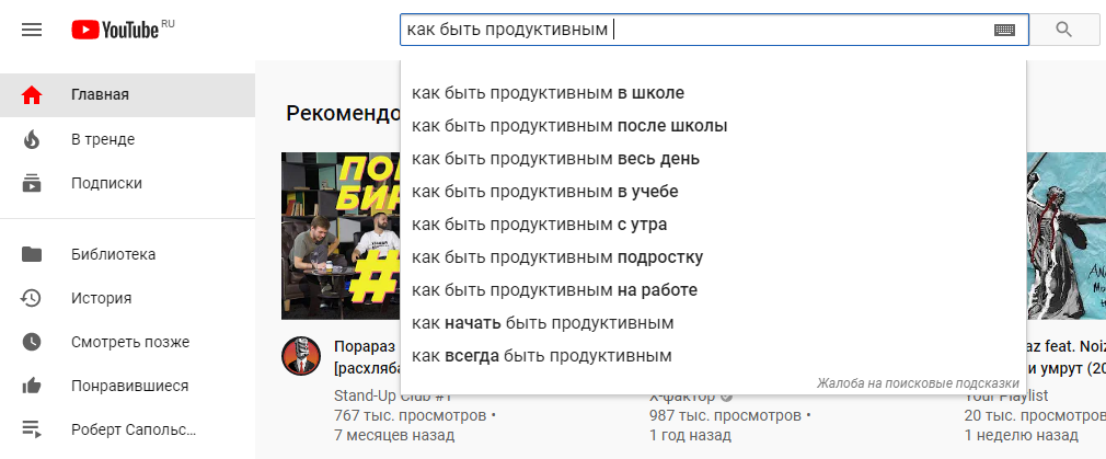 Запрос «как быть продуктивным в школе» в подсказках, значит, многие ищут такие видео, тема востребована.