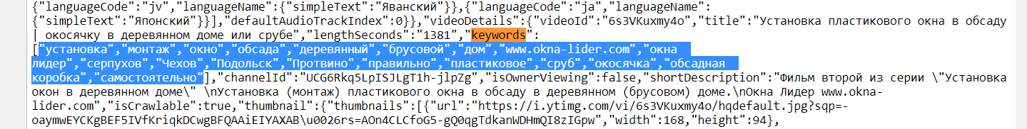 Еще один источник ключей — теги видео. Они скрыты, так что нужно посмотреть код страницы: через Ctrl+F откройте поиск и введите «keywords», ключи будут перечислены в кавычках через запятую.