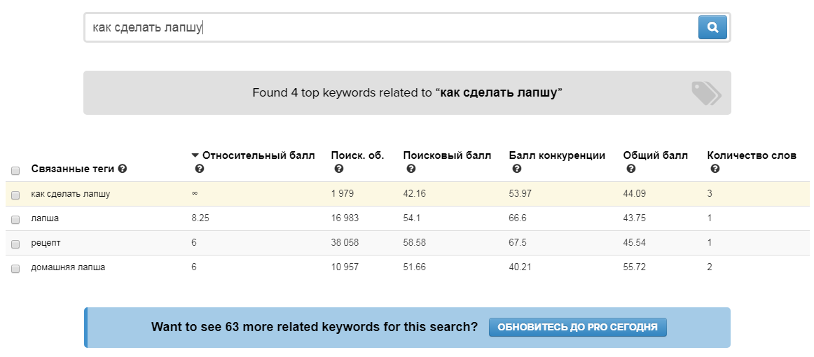 Инструмент автоматически ищет и показывает много вариантов ключей с «длинными хвостами» для введенного запроса. Частотность, тренд за год и конкуренцию можно узнать в платных тарифах инструмента, но сами ключи видны и так. Их можно использовать в качестве идей для новых роликов.