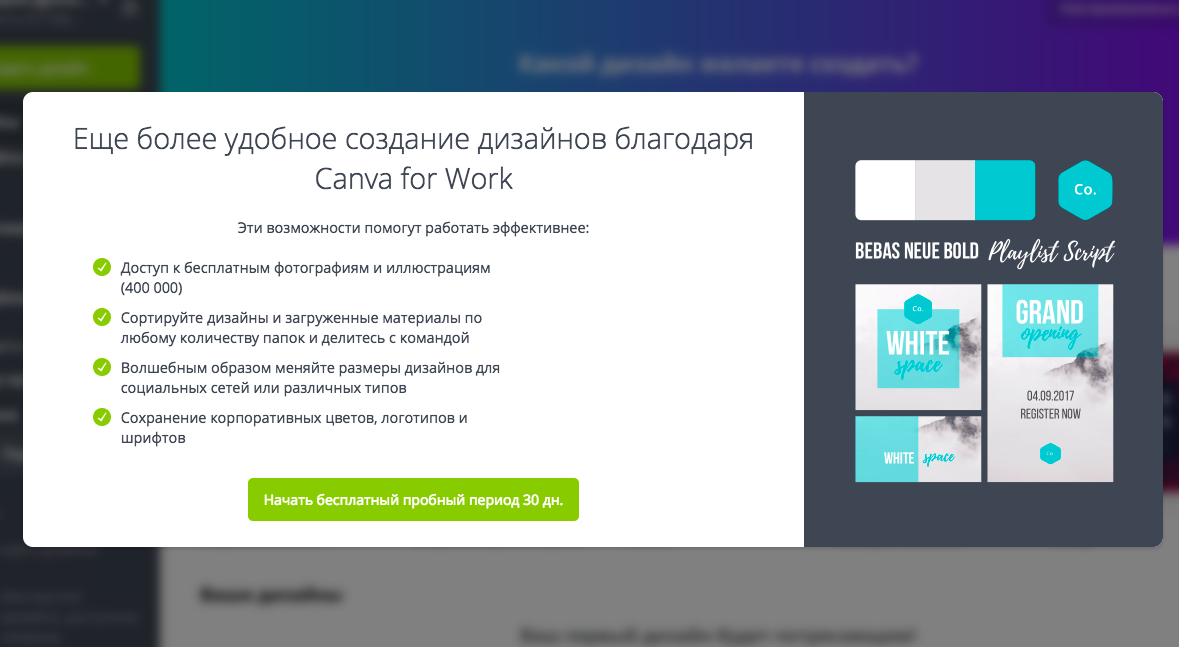 Чтобы пользоваться всеми преимуществами работы командой, переходите во вкладку “Canva for Work”. Вы сможете быстро делиться набросками и папками со своими коллегами. Канва для работы — платная опция. 12.95 $ в месяц на одного члена команды. Первые 30 дней использования — бесплатно. Этот тарифный план дает много преимуществ. Но если вы работаете в одиночку он не нужен.