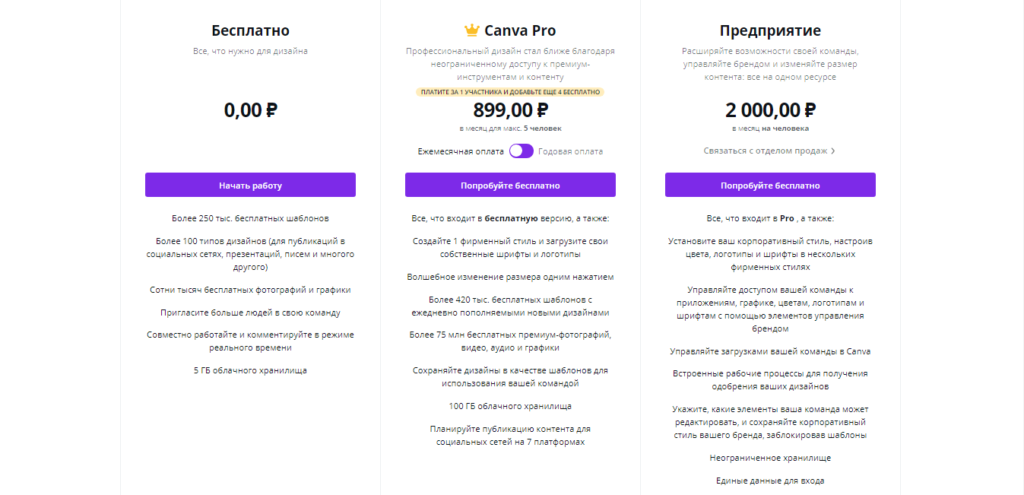 Canva работает как в платной, так и в бесплатной версии. Бесплатный тариф предлагает: