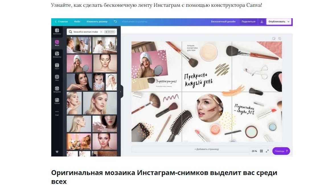 Возможности сервиса не ограничиваются только созданием презентаций. Поэтому давайте разберем, как создается бесконечная лента разными способами для инстаграм пользователями в Канве. Это еще одно популярное направление.