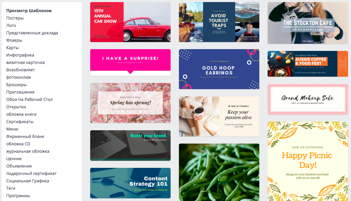 Canva отлично подойдет не только для иллюстрирования рекламных кампаний или журналистских статей, но и владельцам бизнесов, на первый взгляд, не связанных с контентом и интернетом. Здесь найдутся шаблоны для владельцев кафе, баров и ресторанов, агентств недвижимости и туроператоров, дизайнеров интерьера и мебельных мастерских, салонов красоты, ритейла, образовательных организаций и НКО.