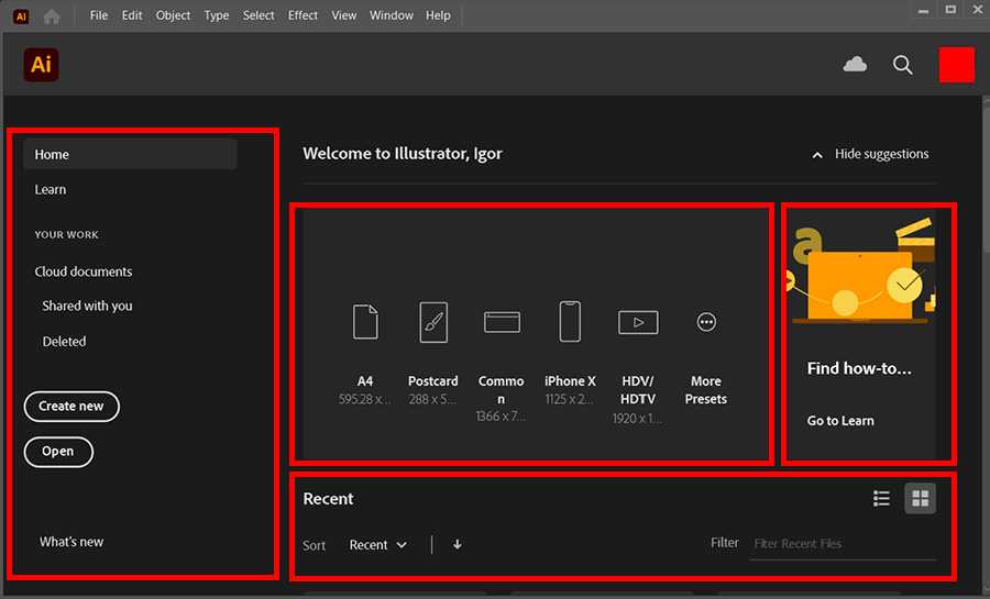 Перед тем как непосредственно перейти к обзору рабочего пространства в программе Adobe Illustrator, нам необходимо рассмотреть такой важный элемент, как домашний экран.