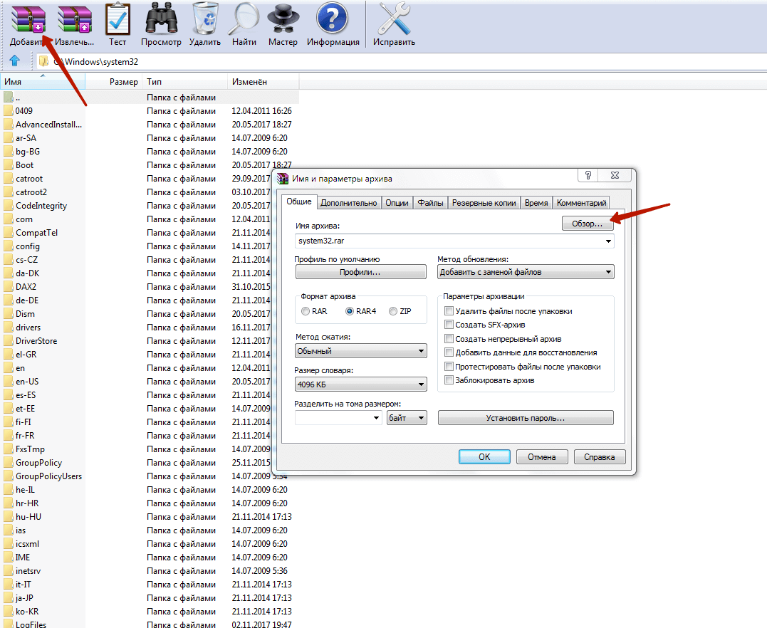 Нижеприведенное руководство поможет выбрать тип сжатия при создании архивов с помощью ВинРАР. Для начала нужно запустить приложение и нажать «Добавить» на панели инструментов. Появится окно для настройки имени архива и других параметров, в котором можно нажать кнопку «Обзор», чтобы ввести название и указать место, где нужно сохранить упакованную папку.