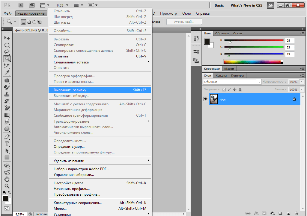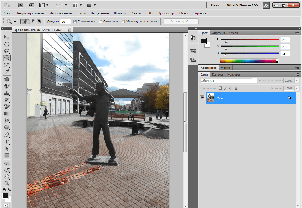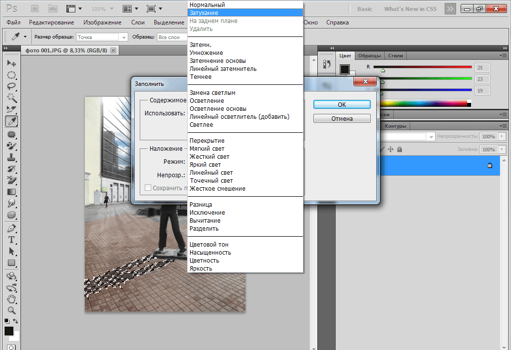 ». Эта функция, кстати, представляет собой обновление программы Photoshop CS5, т.е. в предыдущих версиях её нет. Для того чтобы воспользоваться этой функцией, также выделите тень при помощи «Волшебной палочки» и выберите пункт меню «Редактирование-Выполнить заливку