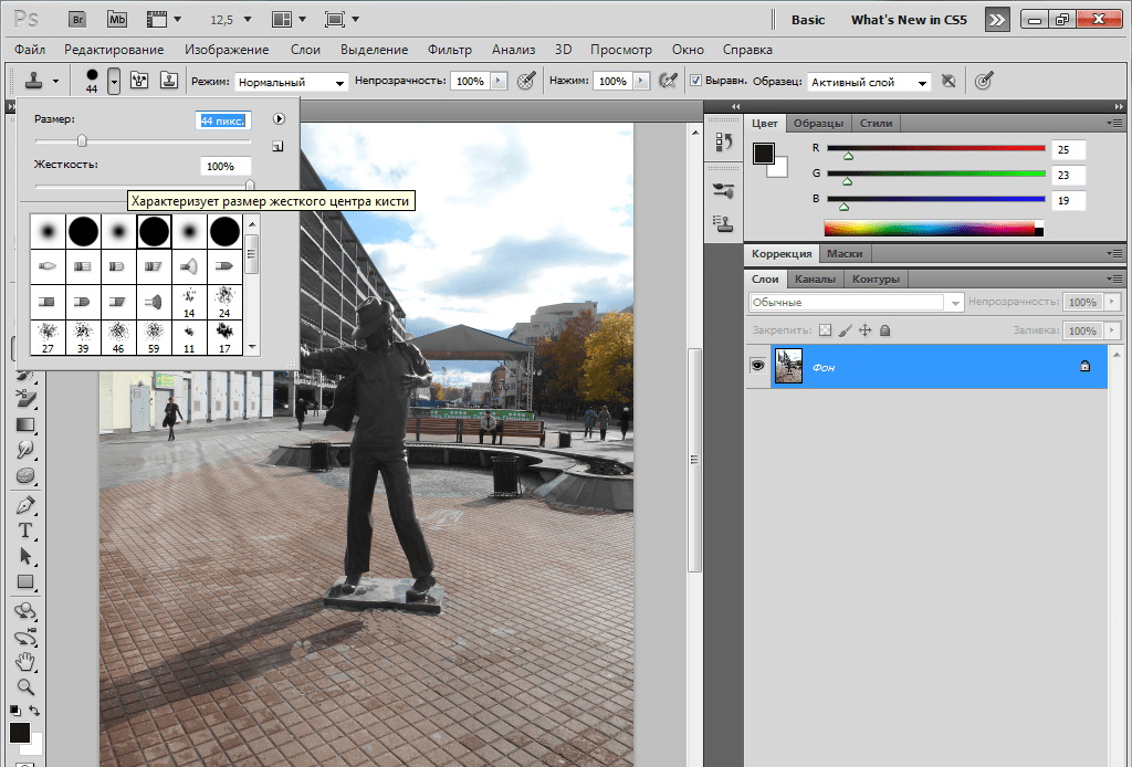 Здесь тень от памятника слишком длинная и слишком тёмная. Удалить её в первом случае можно при помощи инструмента «Штамп». Инструмент «Штамп» создает копию образца изображения и переносит на другую желаемую часть изображения.