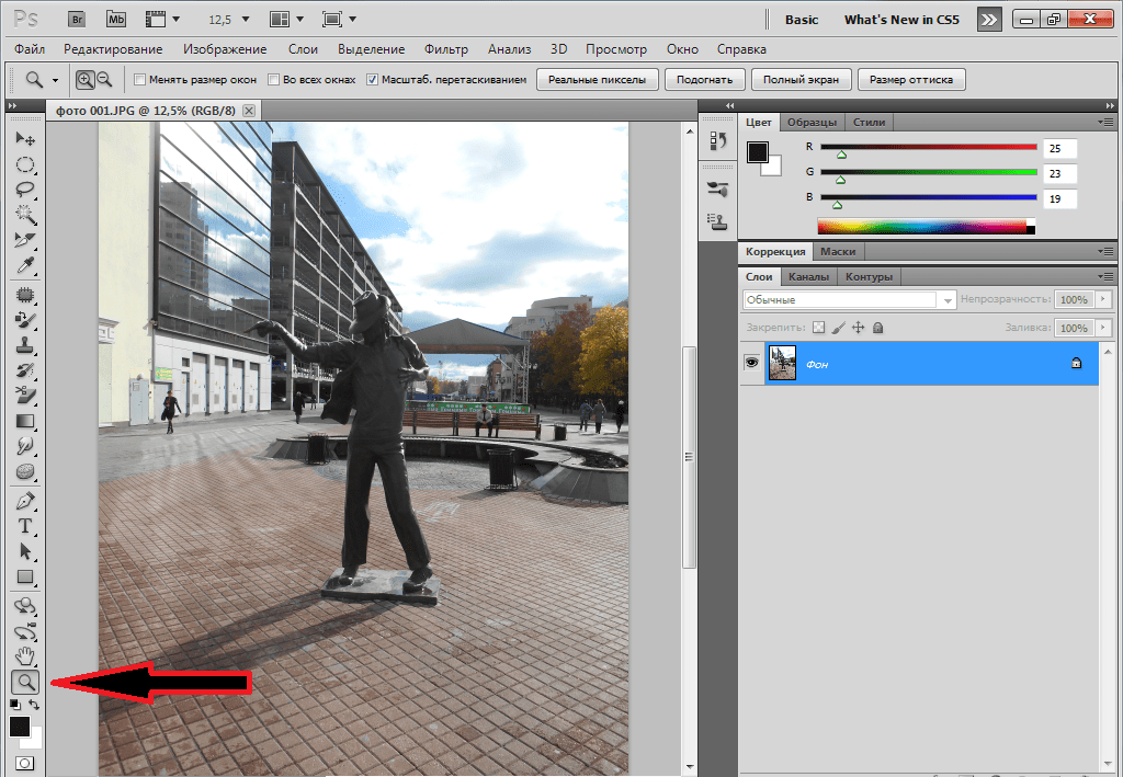1. Увеличьте ту часть изображения, где располагается тень, при помощи инструмента «Масштаб