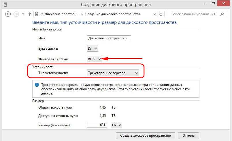 - Зеркальное пространство предназначено для повышения производительности и обеспечивает хранение нескольких копий для защиты файлов на случай сбоя жесткого диска. Зеркальные пространства в два этапа образуют две копии файлов и устойчивы к поломке одного диска, в свою очередь, трехсторонние зеркальные пространства устойчивы к отказу двух дисков. Идеально подходят для хранения различных данных, от файловых ресурсов общего назначения до библиотеки виртуальных жестких дисков. В случае форматирования пространство будет отформатировано в формат файловой системе ReFS. Зеркальные пространства требуют, по крайней мере, двух дисков, а трехсторонние – не менее пяти.