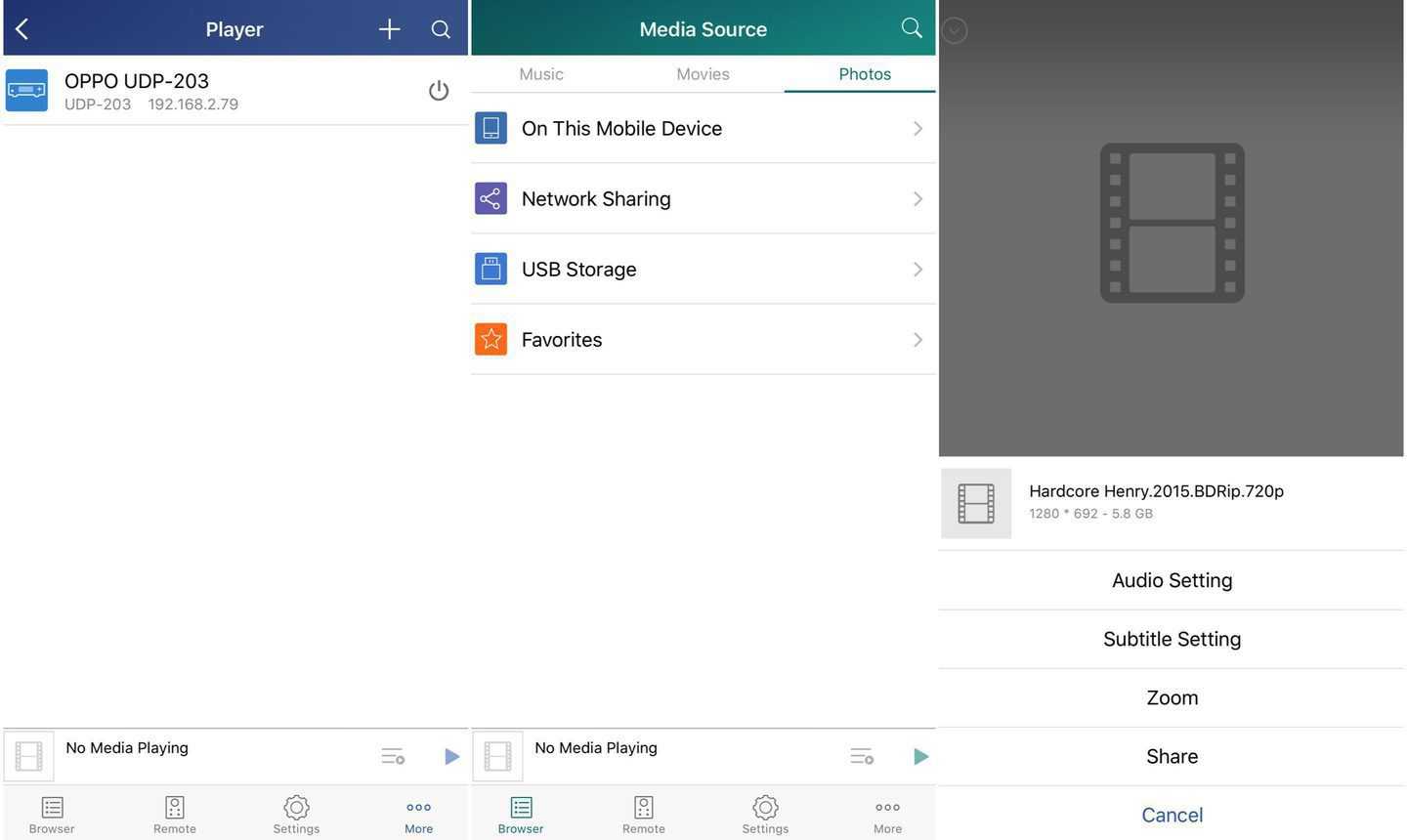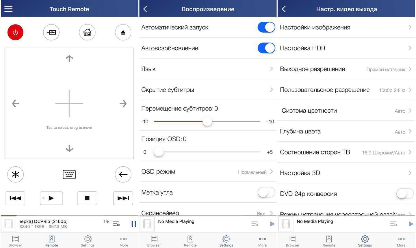 Помимо пульта ДУ управлять проигрывателем можно и при помощи приложения OPPO UDP-20X MediaControl (есть для iOS и Android). Оно предлагает как подробные настройки (см. выше на скриншотах), так и управление экранным меню при помощи тач-панели в интерфейсе.