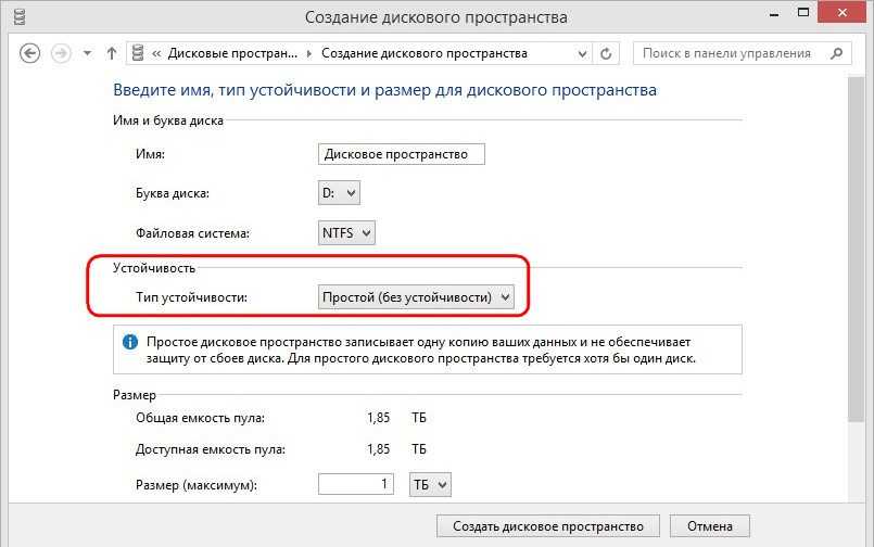 - Простое пространство предназначено для повышения производительности, но они не обеспечивают защиты файлов на случай сбоя жесткого диска. Лучше всего подходят для хранения временных данных (таких как файлы рендеринга видео), резервное копирование файлов в редакторе изображений и файлы промежуточных объектов компилятора. Чтобы создать простое дисковое пространство требуется, по крайней мере, два диска.