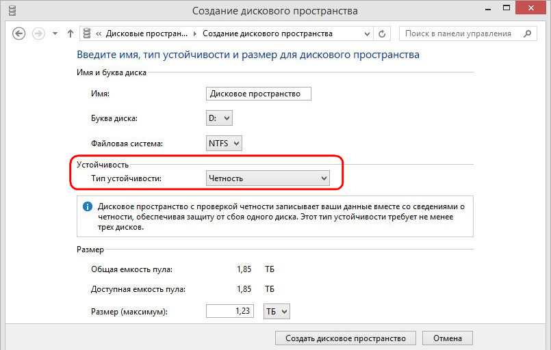 Чётность – это аналог RAID 5, массив из как минимум трёх носителей, обеспечивающий отказоустойчивость при выходе из строя одного из них. Увеличивается скорость чтения данных, но из-за специфики конфигурации несколько снижается скорость их записи. Файловая система – только NTFS.