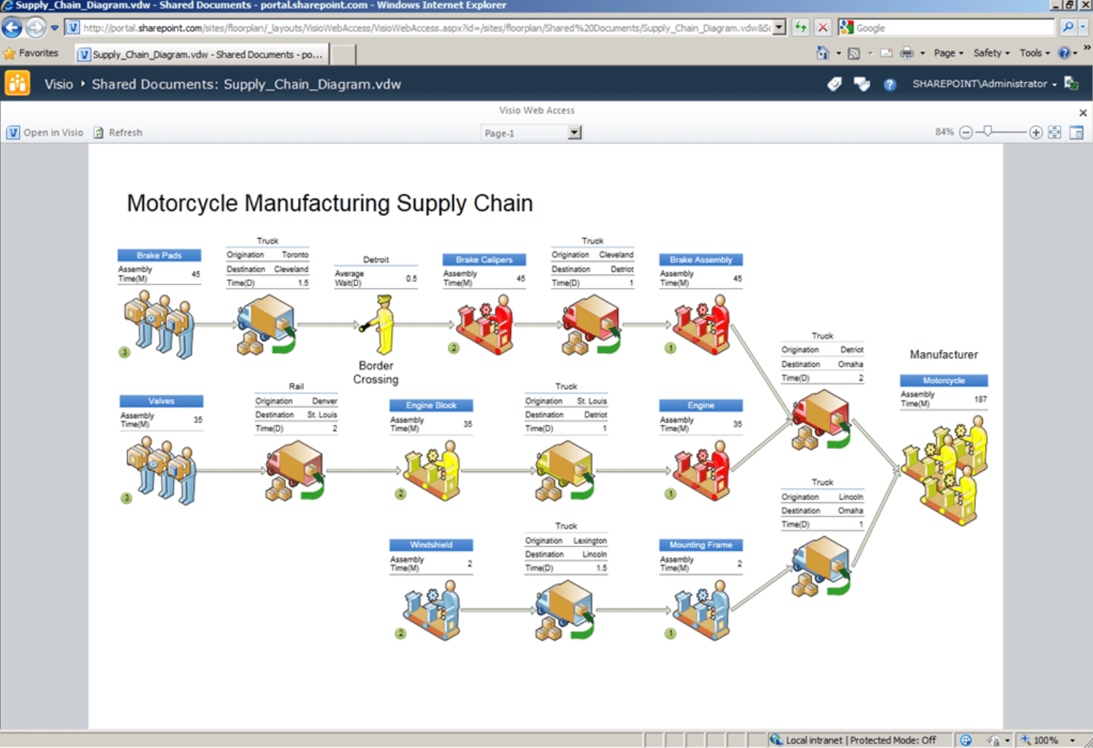 Вот так выглядит документ Visio, открытый при помощи SharePoint в браузере Internet Explorer